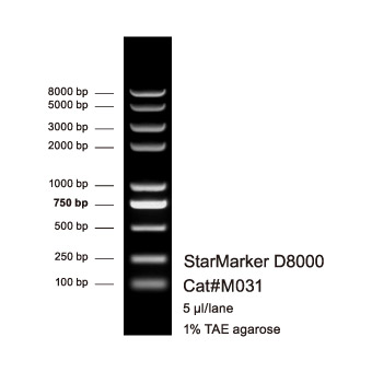 本產(chǎn)品為預(yù)混有 1× 上樣緩沖液的即用型 DNA 分子量標(biāo)準(zhǔn),由 9 條線狀雙鏈 DNA 條帶組成,適用于對(duì) 100-8000 bp 的雙鏈 DNA 分子大小的估算和粗略定量。本產(chǎn)品的 9 條帶分別為 100、250、500、750、1000、2000、3000 和 5000 bp、8000 bp。其中 750 bp 條帶濃度最大,為 100 ng/5 µl,其余條帶濃度約為 50 ng/5 µl。