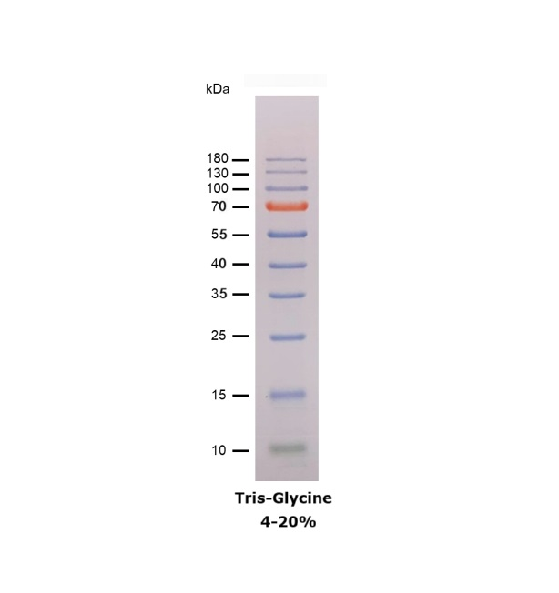 本產(chǎn)品由跨度從 10-180 kDa 的 10 種高度純化預(yù)染的重組蛋白質(zhì)組成。其中 10 kDa 條帶為綠色預(yù)染條帶,70 kDa 條帶為紅色預(yù)染條帶,方便判斷各個條帶的準確位置。本產(chǎn)品適合作為 SDS-PAGE 電泳時,變性蛋白樣品的分子量參照,并可實時觀察蛋白樣品的電泳分離狀況,也可用于檢測 Western blot 的轉(zhuǎn)膜效率。由于共價結(jié)合的染料會影響蛋白質(zhì)分子的電泳遷移率,本產(chǎn)品僅適于粗略地估計目的蛋白樣品的分子量。