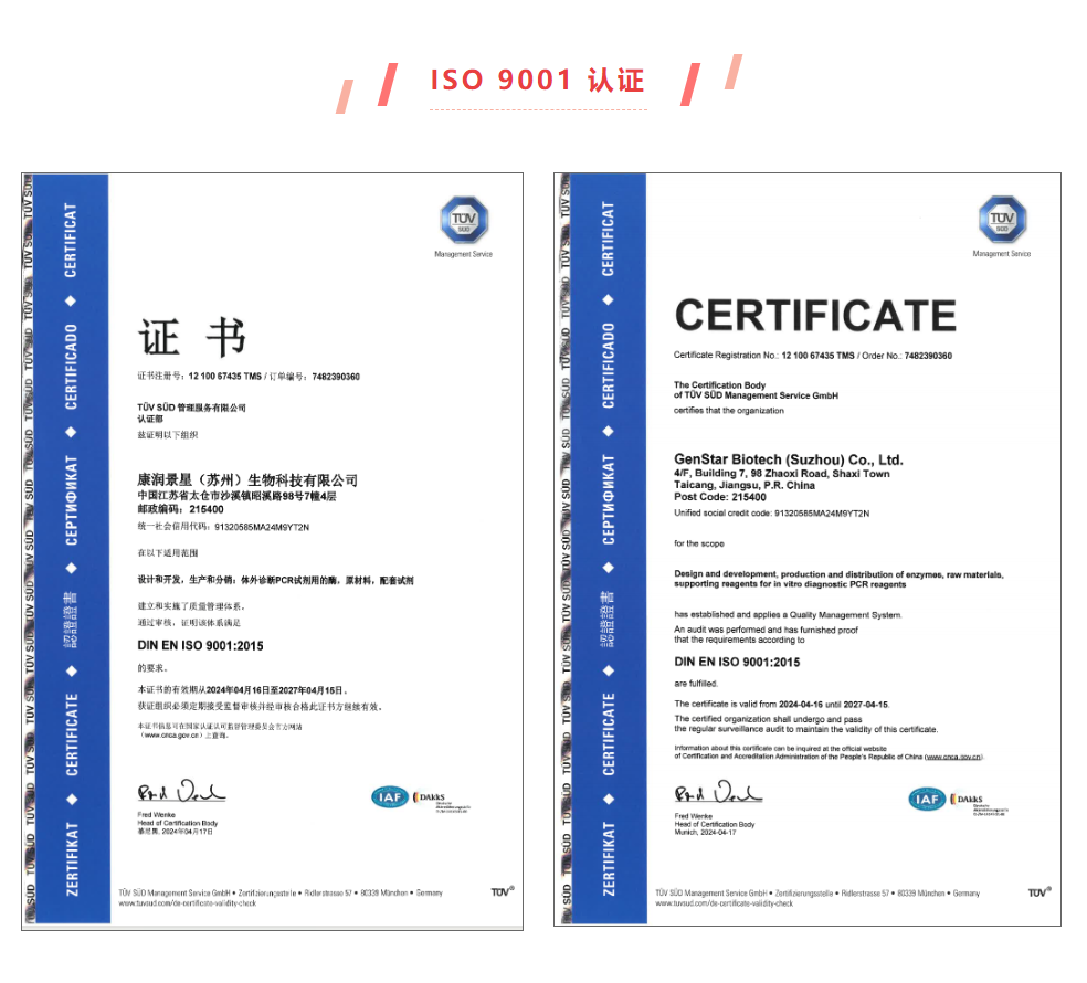 近日,康潤景星(蘇州)生物科技有限公司(GenStar全資子公司)經(jīng)國際第三方檢測認證機構(gòu)TÜV南德意志集團(以下簡稱“TÜV南德”)的嚴格審查,再次通過ISO9001:2015質(zhì)量管理體系和ISO13485:2016醫(yī)療器械質(zhì)量管理體系認證審核,并獲得證書。